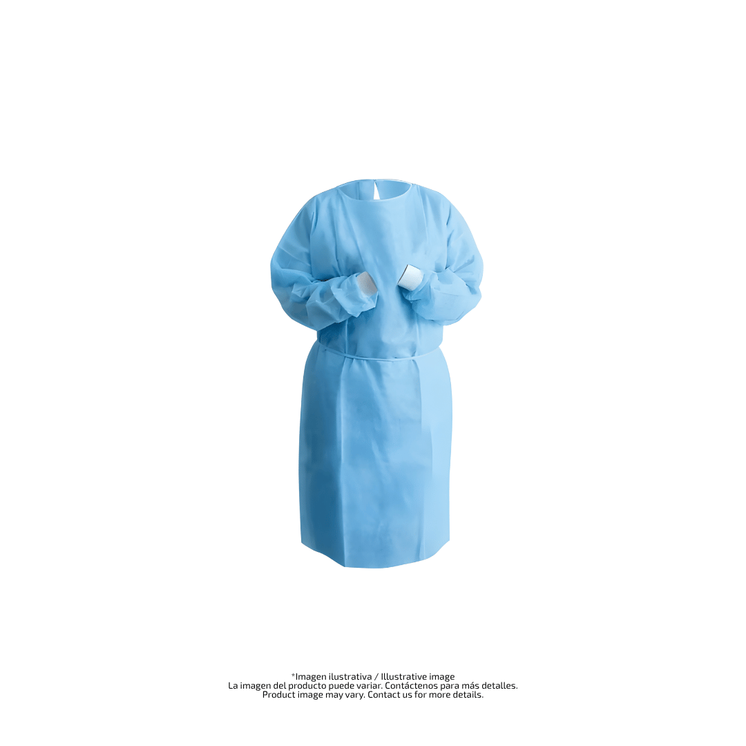 Incorpora puños de punto para sellar con guantes, cierre posterior para facilitar la colocación asistida y cuello alto que amplía la cobertura anterior. El diseño es ligero, de uso único y está disponible en múltiples tallas para adaptarse a distintos biotipos y protocolos de farmacia oncológica y áreas de infusión.