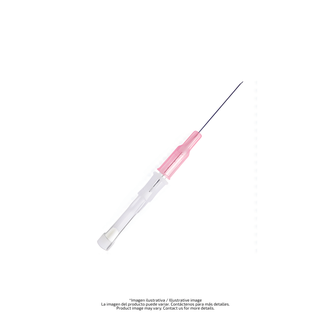 Cánula intravenosa 22G x 1" en poliuretano (PUR) para acceso venoso periférico con caudal moderado. Aguja biselada con cámara de retorno, aletas de fijación y conexión Luer estándar. Estéril, libre de látex y de un solo uso. Se suministra sin jeringa.