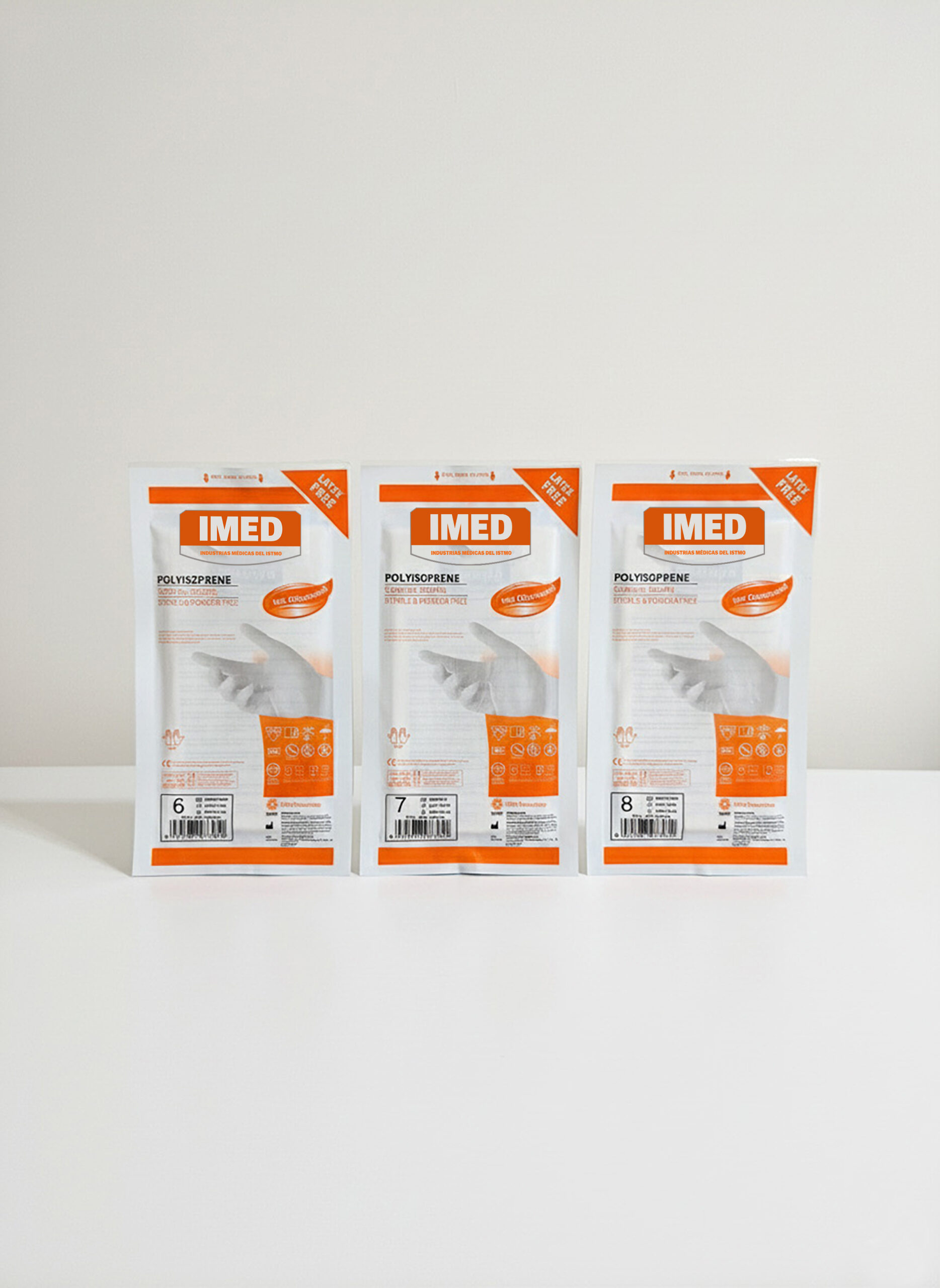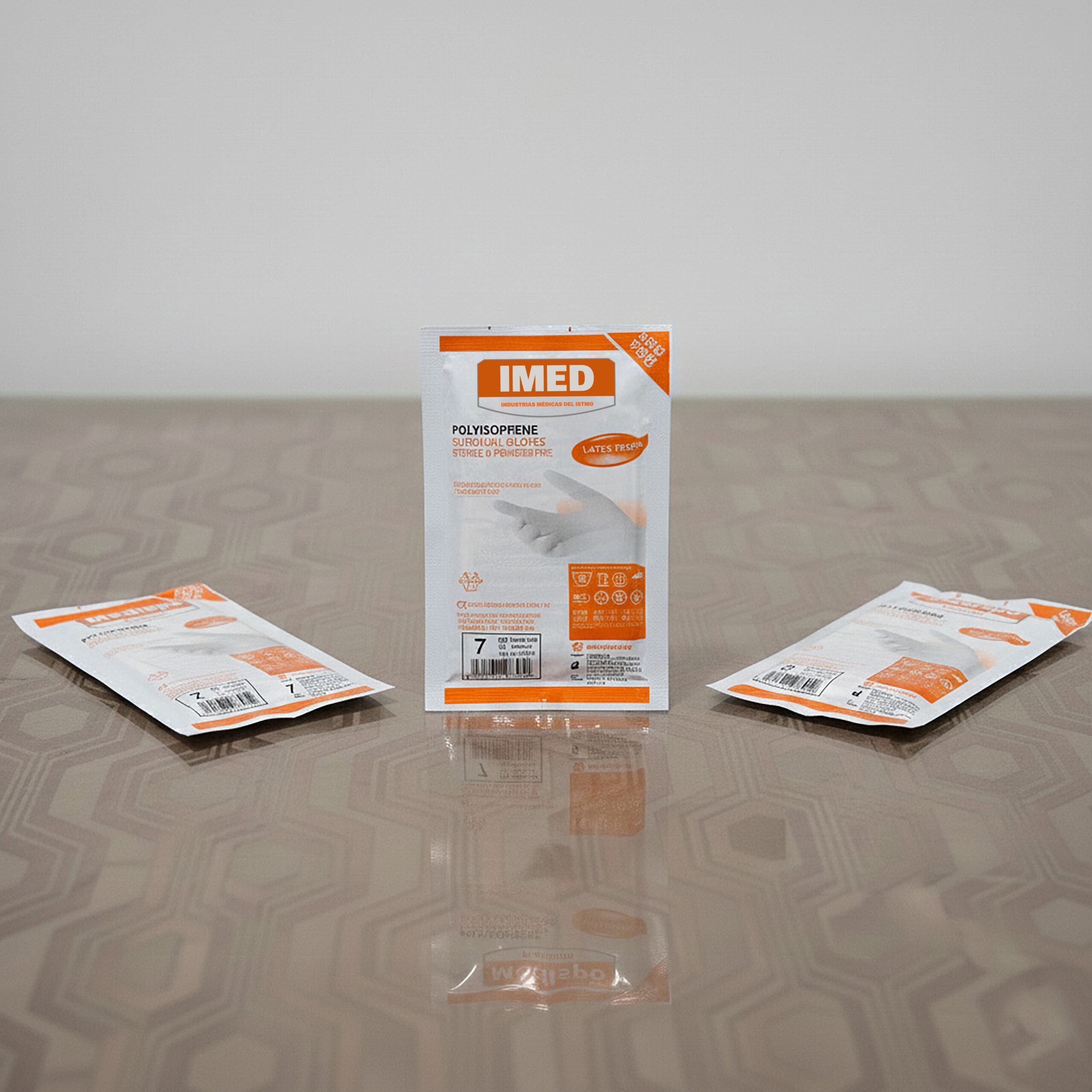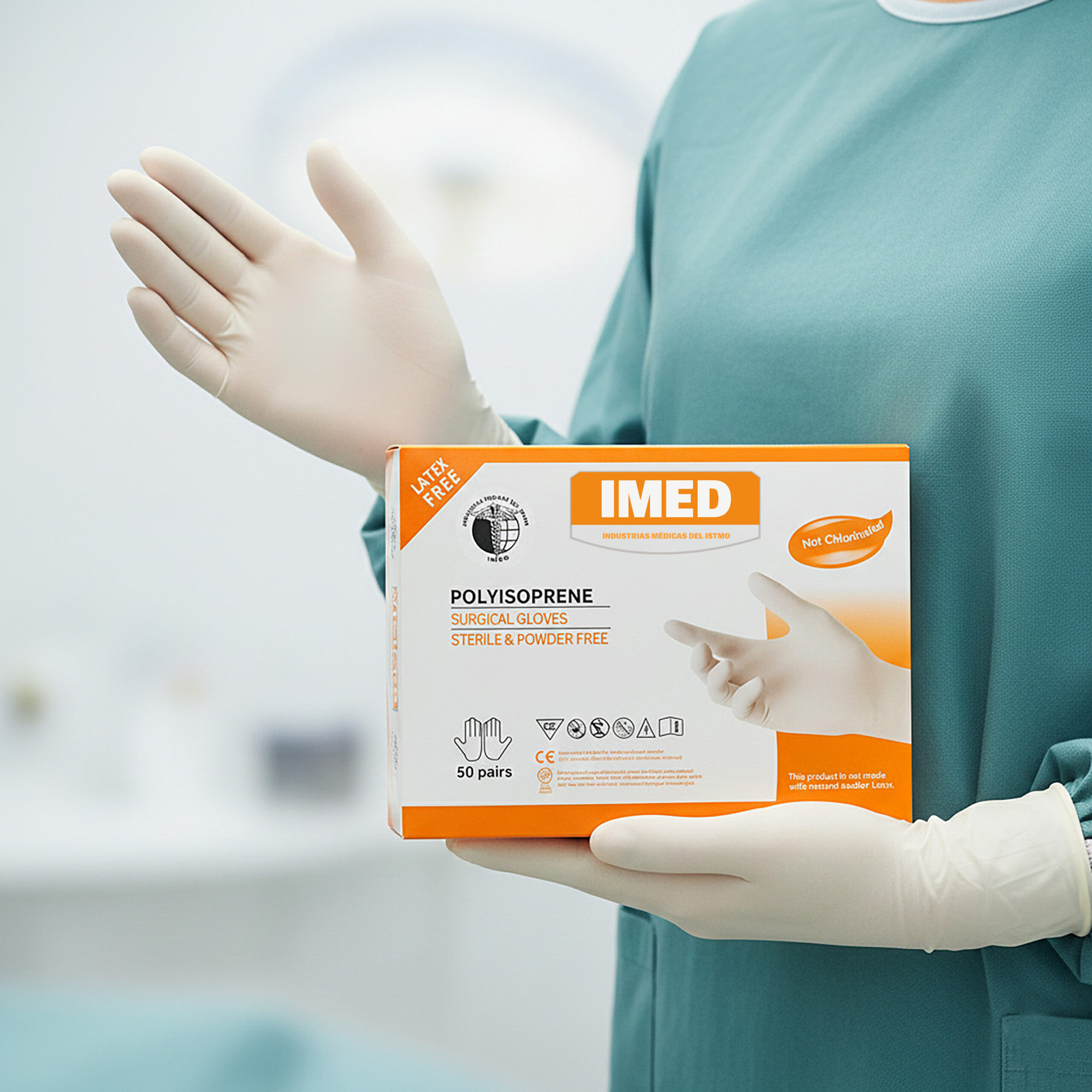 Guantes quirúrgicos de poliisopreno, libres de látex, microtexturizados, estériles por E-Beam, con diseño anatómico y alta sensibilidad táctil. Cumplen MDR 2017/745 y ASTM D3577.