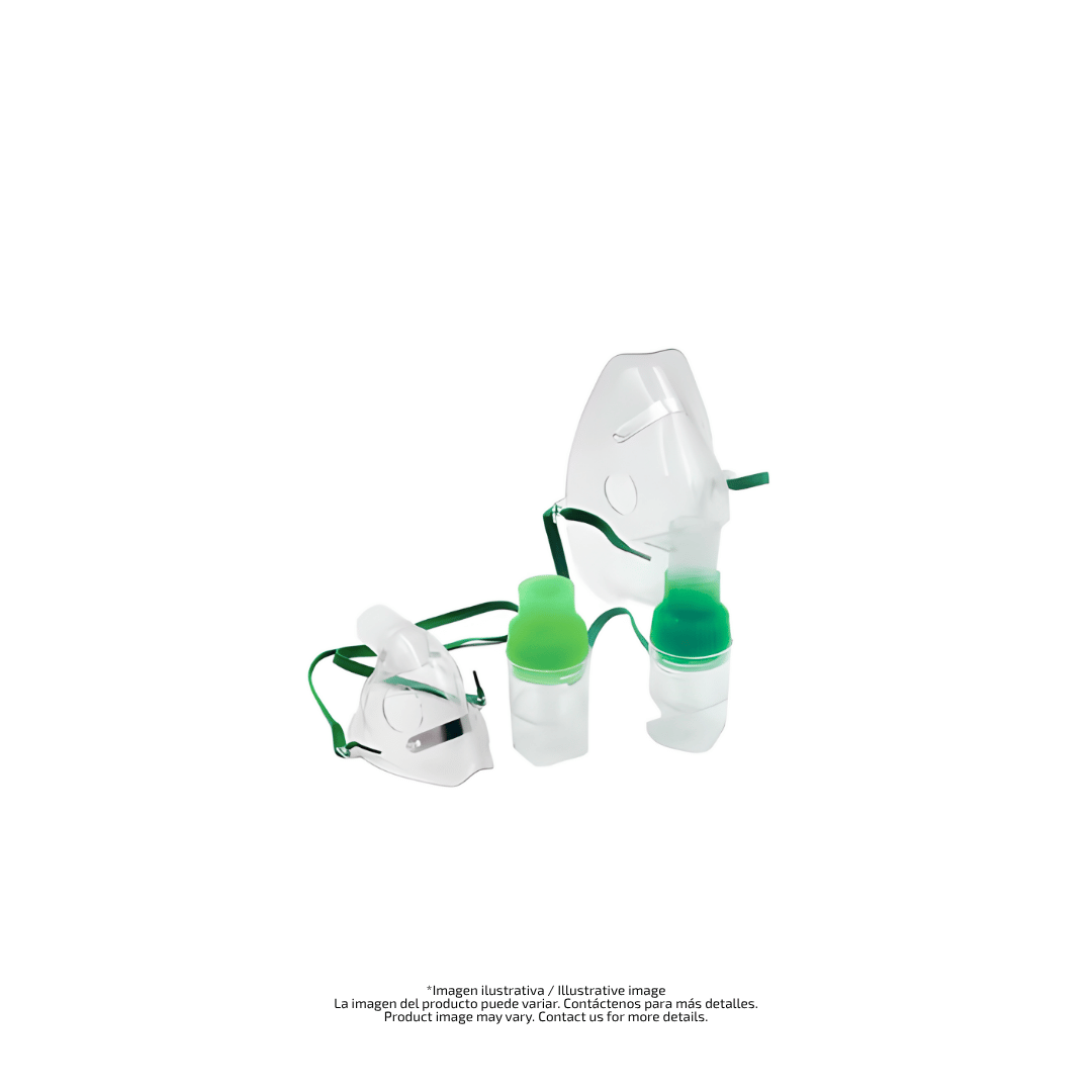 Se presentan en dos tamaños (adulto y pediátrico) para un sellado adecuado según la fisonomía. Incluyen copa nebulizadora de alto rendimiento, tubo flexible para conexión a fuente de aire/oxígeno y elástico de sujeción. Son compatibles con la mayoría de compresores y nebulizadores tipo jet disponibles en el mercado.