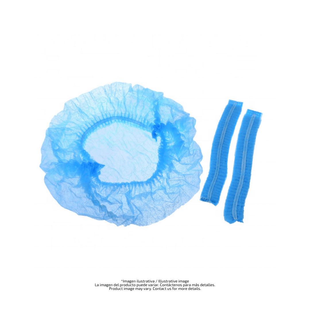 Redesilla tipo tira descartable en color celeste, de polipropileno no tejido 10 g/m² y doble elástico para ajuste cómodo. Indicada para higiene capilar en hospitales, laboratorios, industria alimentaria y centros de estética.