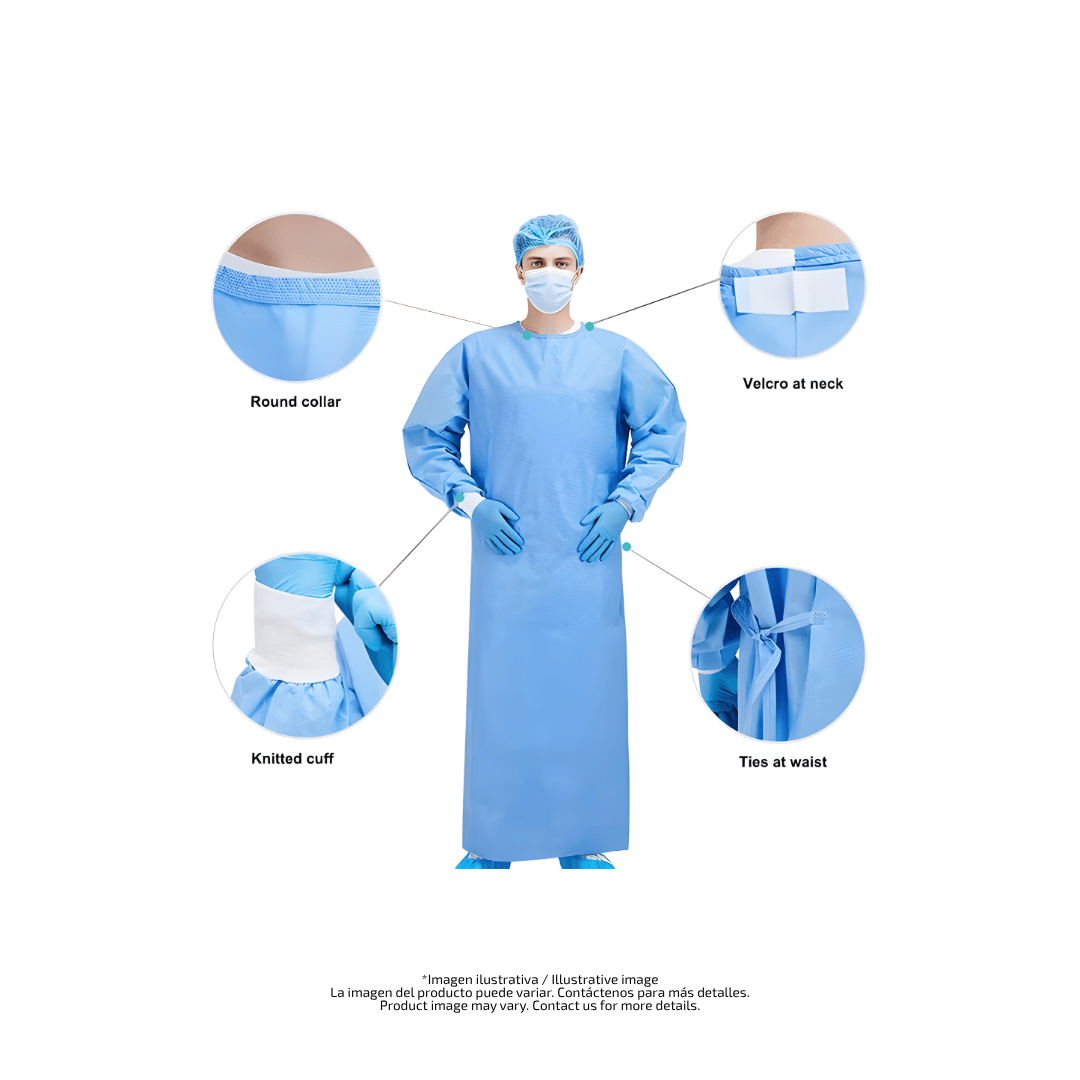Batas quirúrgicas (x2) No tejido grado médico (p. ej., SMS/SMMS) con refuerzo impermeable en pecho y mangas; puños elásticos; cintas para ajuste seguro; transpirables.